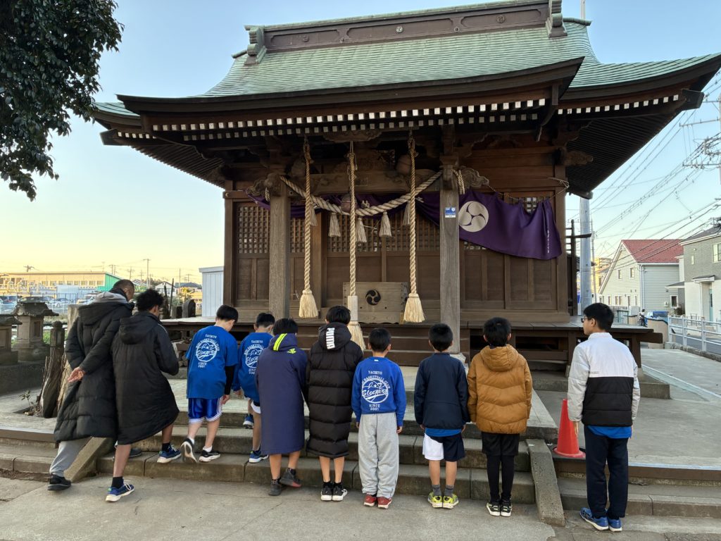 新年初の土曜練習。コーチたちにみっちり指導していただいた後、各自が今年の目標をカードに書きました。その後、近所の八幡神社にみんなでお参りに…神様の前で誓いを立てました。
